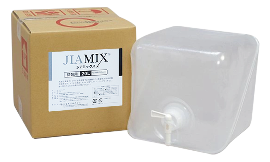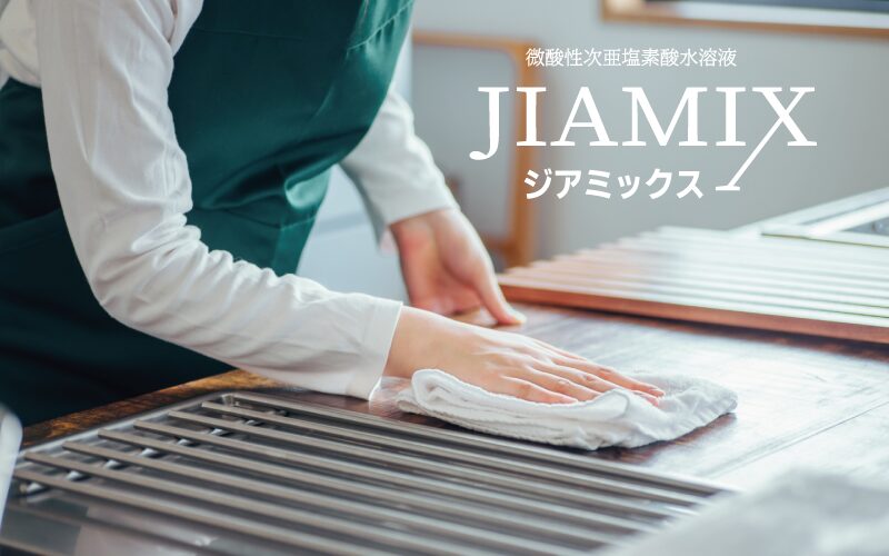 ジアミックスは水に次亜塩素酸ナトリウムと希塩酸を希釈反応させ、生成した次亜塩素酸を主成分とする消臭・除菌水です。次亜塩素酸の強力な酸化反応により除菌し臭いを分解します。